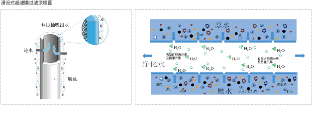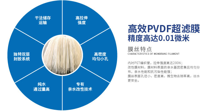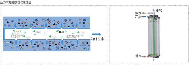 該系列設備以超濾膜技術為核心,超濾膜凈水技術是嚴格的、綠色的物理分離技術。超濾膜孔徑大小在10-20nm之間,水質凈化過程中超濾膜以膜兩側的壓力差為驅動力在一定的壓力下當原水流過膜表面時,超濾膜表面密布的納米孔只允許水及小分子物質通過而成為潔凈水,而原水中尺寸大于膜孔徑的物質則被截留在膜的進水側,從而實現對原水的凈化處理,獲得高品質飲用水。